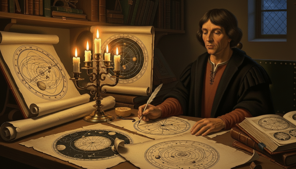 Copernicus proposed the heliocentric model, which stated that the Sun — not Earth — is at the center of the solar system. This bold idea challenged centuries of belief and transformed astronomy forever.