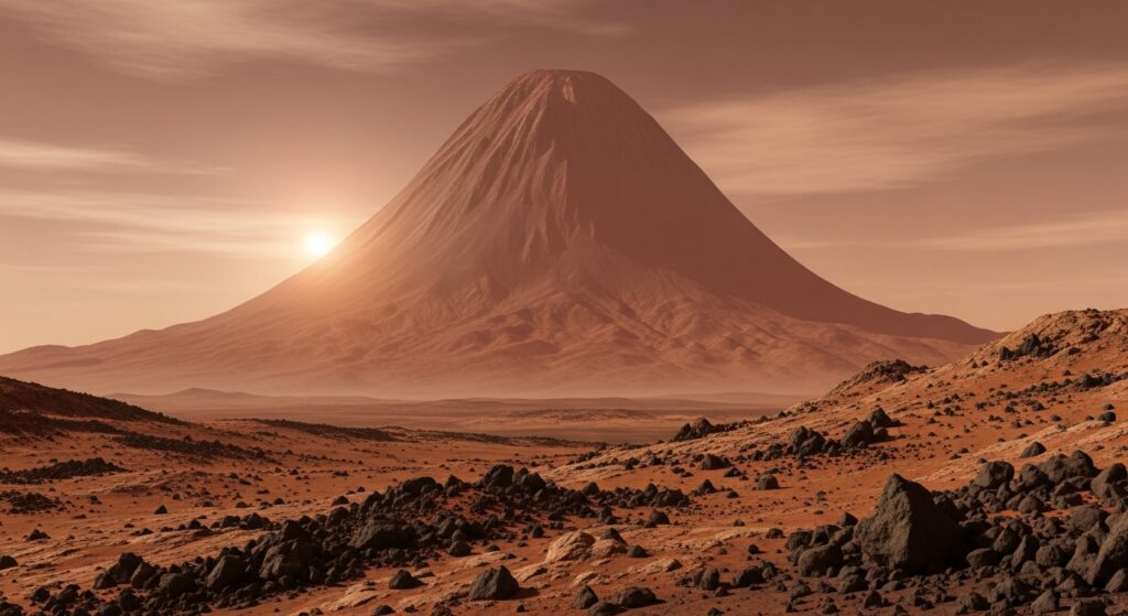 Mars contains Olympus Mons, the tallest mountain in the solar system. This enormous shield volcano stands about 22 km high, dwarfing Mount Everest.