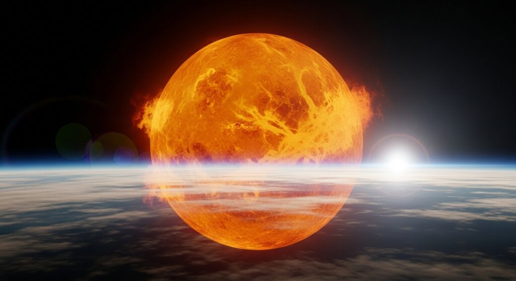 Venus also spins in the opposite direction of most planets, meaning the Sun rises in the west and sets in the east. Its thick atmosphere traps heat through an extreme greenhouse effect, making it the hottest planet in the solar system.